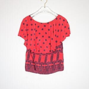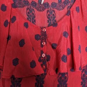 Free People Red Ruffle Neck Blouse Buttons Short Flutter Sleeve Size S