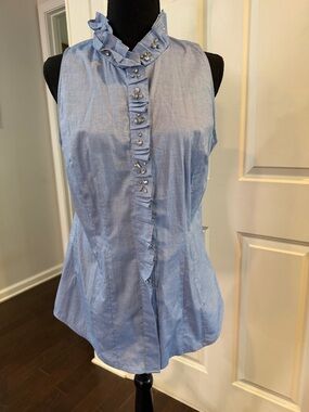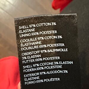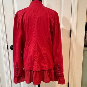 Chic red blazer with ruffled edges and button accents. Ideal for a bold fashion statement.