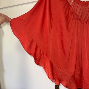 Chic red satin top by Free People. Smooth fabric with elegant details. One arm goes through a hole, the other is like a wrap. It’s super cool!