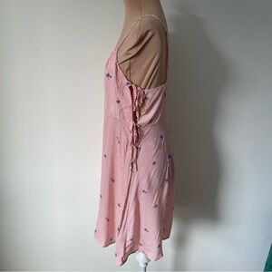Free People royal blue palm trees print on an off white and salmon pink/red striped background sleeveless mini dress. Features straight across neckline and thin spaghetti style adjustable shoulder straps. Open along upper side seams with two tie detail to close and adjust bust measurement. Seam at high waist. A-line silhouette through short skirt length, falling well above knee. Lined through bust only. Lightweight fabric without stretch.
