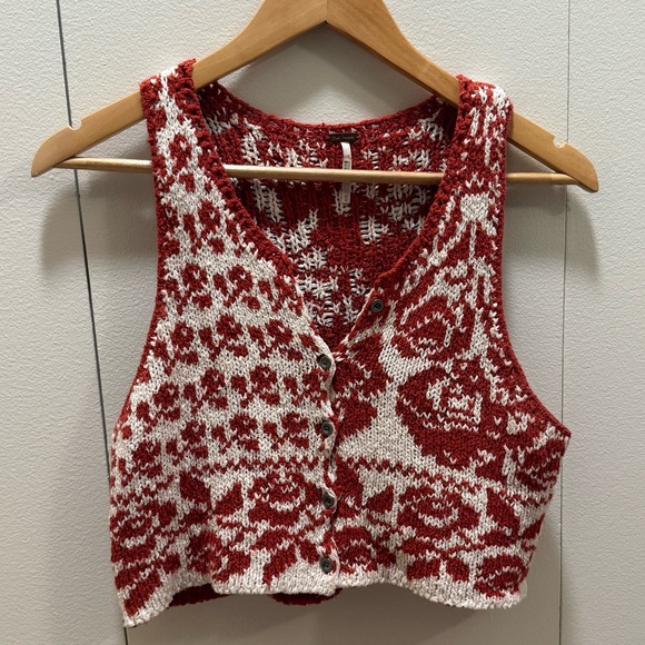 Free People, size medium. Chic knit tank top with button-up front. Red and white pattern. Perfect for layering. In good condition, lightly used.