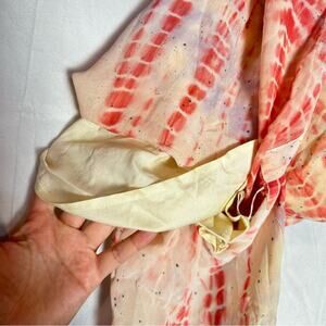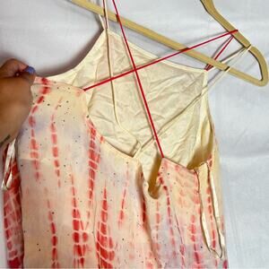 Crisscross back straps. Ivory with reddish pink and faded purple tie dye style. Lined at the top/bra area and sheer for the lower half. Slits up both sides. Slight high low hem. This is in great preowned condition.
