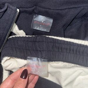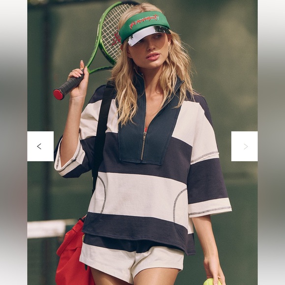 Comes with the top and bottoms. Worn only once! Basically brand new. Stylish navy and white striped sweatshirt. Features a half-zip front. Perfect for casual outings.