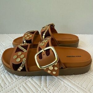 Features: Slip-on style, backless, double leather strap design, adjustable buckle closure, molded footbed, suede and stud details, tread outsole