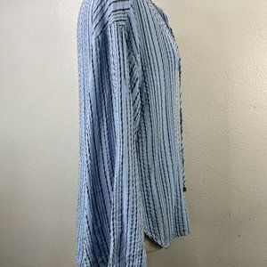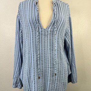Rhythm Of The Night striped peasant-style tunic from Free People. Notched neckline with string ties. Puffy 3/4 length peasant drop shoulder sleeves. High-low hem. 80% rayon/20% polyester has a slight seer sucker texture
