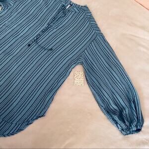 Free People Rhythm of the Night Tunic Striped Blue Size Medium. New with Tags. American made lightweight and oversized tunic featuring a striped pattern. V-neckline with ties. Wide dolman sleeves with elastic cuffs. High low hem. 20% Polyester 80% Rayon. Runs big. Please see the photos for more details and measurements. Smoke and Pet free home. Thank you so much for looking!!