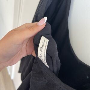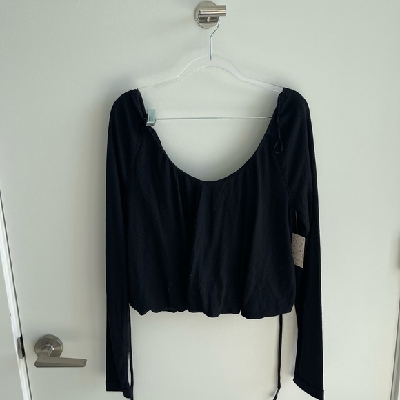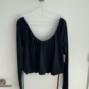 Chic black blouse with long sleeves. Features a scoop neckline. Perfect for versatile styling.