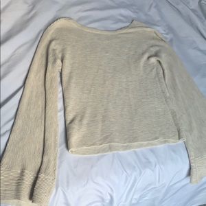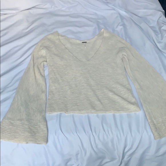 Free People sweater, ribbed texture, cream ish color. Bell sleeves, low cut neck, fitted and slightly cropped. Worn once so it’s in like new condition. I usually wear a medium and this is an XS and it still fit.