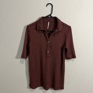 Keywords: Free People, Ribbed Knit Top, Button Down Top, Burgundy Top, Short Sleeve Top, Collared Top, Casual Top, Boho Top, Knit Top, Womens Top, Everyday Top