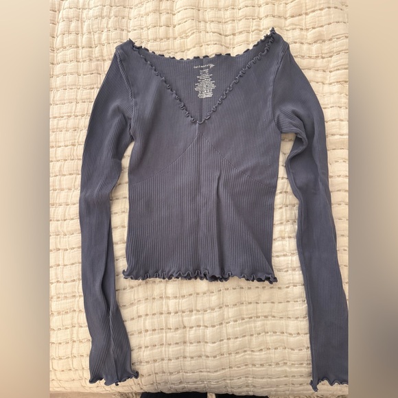 Chic ribbed top with a flattering V-neck. Features long sleeves and ruffled edges. Perfect for layering or wearing alone.