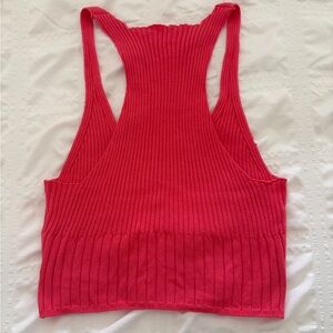 Cropped ribbed knit tank with a deep V-neck. Racerback silhouette for easy layering. Soft stretchy fabric for comfort. Vibrant pink hue adds a pop to outfits.
