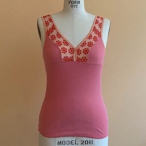 Cotton tank with lace detail at front neckline. Form fitting with scoop back neck. Size M, fits more like a small.