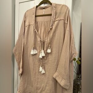 Crinkled tunic, made from our sheer and gauzy Endless Summer fabric, featuring an oversized, shapeless fit and a plunge neckline featuring dip dye tassel accents. Beachy raw trim. Throw on top of a bikini or layer over one of our seamless styles for an effortless look.