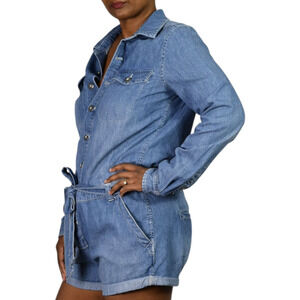 Free People Rivet romper FEATURES a button front collared shirt bodice and cuffed short bottoms. Long sleeves. Pointed collar. Belted waist. Long sleeves. Two chest pockets, side pockets and welt back pockets.