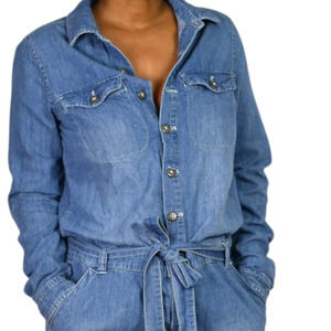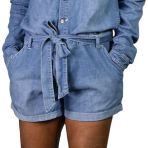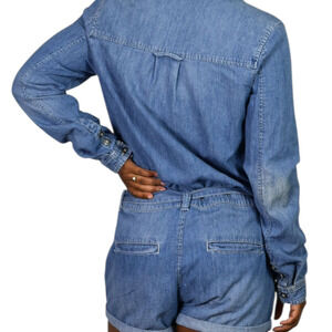 Free People Rivet Romper Blue Chambray Denim Cuffed Short Long Sleeve Belt Small
