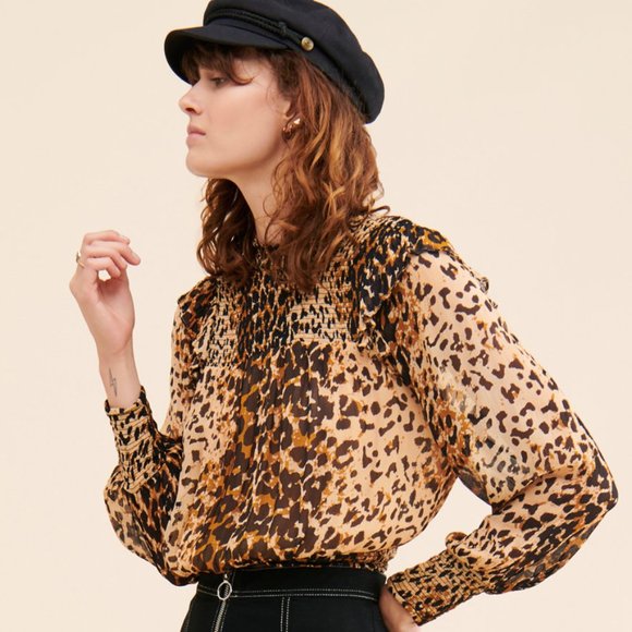 This feme top featured in a high-neck silhouette with ruffle detail and elastic banded bottom is designed in a lightweight animal printed fabrication with exaggerated sleeves.
