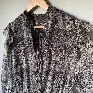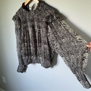 Chic snakeskin print blouse by Free People. Features a stylish high neck and flowing sleeves. Perfect for a bold, fashionable look. Size Large. Like new!