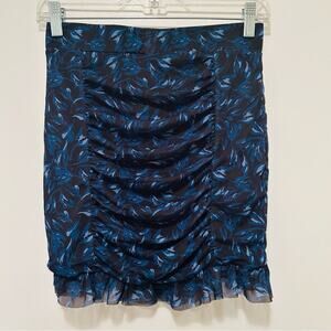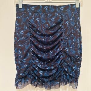 Femme and flirty, this sweet mini skirt is featured in a floral mesh fabrication with ruching throughout and ruffled bottom hem for added dimension