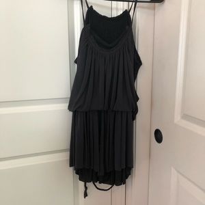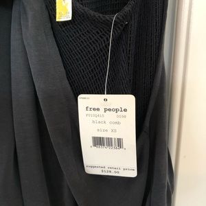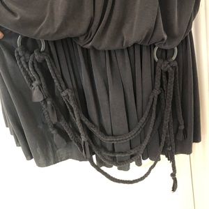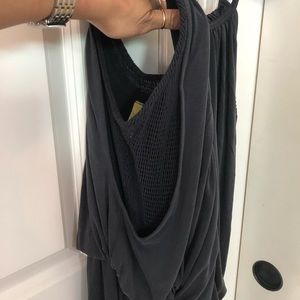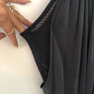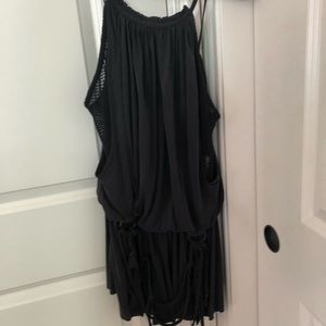 Free people spaghetti strap one piece romper . Charcoal grey in color. Attached inside is a Fishnet top layer. Gathered elastic waist. Bottom has raw edges. Braided loop and tassels hang from pewter rings on front bottom. This romper is silky, soft and super sexy. Size XS but will fit Small as well. Paid $128. Brand new, Never worn, Tags attached.