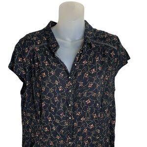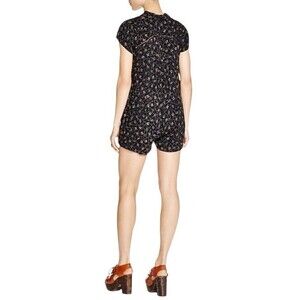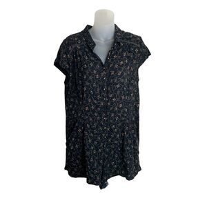 Free People Romper Playsuit Pockets M Black Floral Print Button Up Short Sleeves