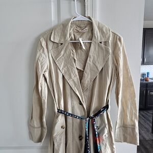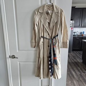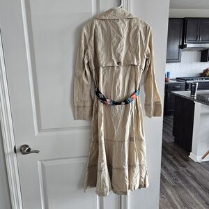 *Defined collar, button-front closure, side pockets. back flap, contrast waist tie