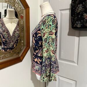 Free People Rosalie Mint Green & Peachy Orange Paisley Bell Sleeve Faux Wrap Top