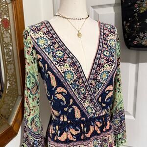 Free People Rosalie mint green and peachy orange multicolor paisley floral pattern long bell sleeve faux wrap top - Size X-Small, see measurements below!