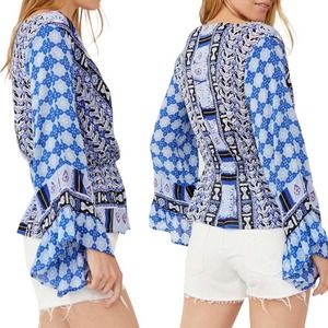 Free People Rosalie Wrap Top In Indigo Combo Bell Sleeve V-Neck Blouse Medium