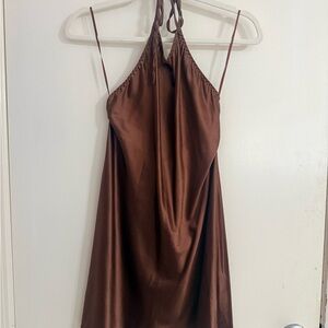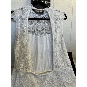 Chic backless dress with intricate lace detailing. Flowy hem and delicate straps. Perfect for a stylish look.