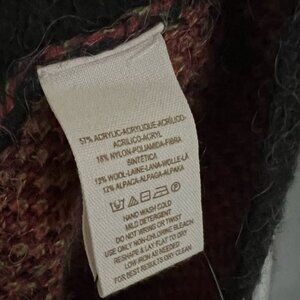 Black, red , and green, fuzzy, wool blend, floral / rose print cardigan. Slouchy fit. Has a single snap closure. Has dropped patch pockets.