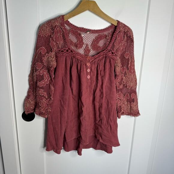 Free People Rose Pink Crochet Lace Floral Boho Flowy Blouse Top Size XS