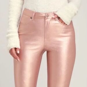 Whether your style is glam and girly or trendy and edgy, the Free People Rose Pink High Rise Vegan Leather Leggings bring the best of both worlds! Metallic vegan leather shapes these essential leggings with a banded waist, belt loops, top button, and zip fly. Five pocket cut, and skinny, tapered pant legs. Unlined. Shell: 100% Polyester with Polyurethane coating. Machine Wash Cold. Imported.