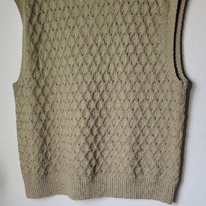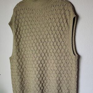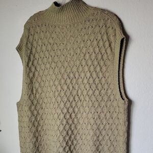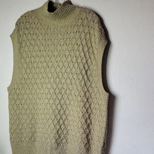 Textured olive turtleneck sweater. Sleeveless design. Ideal for layering.