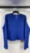 Vibrant Free People royal-blue sweater featuring a plush bouclé / popcorn knit texture with a deep V-neckline, dropped shoulders, and relaxed cropped fit. Soft and cozy 96% cotton, 4% nylon blend. Perfect for layering or adding a pop of color to your winter look.