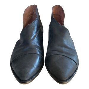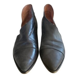 "Closed toe version of FP fave Mont Blanc Sandal, these leather flats are made with the finest Spanish craftsmanship. Leather flats feature side cutouts and a slight stacked heel."