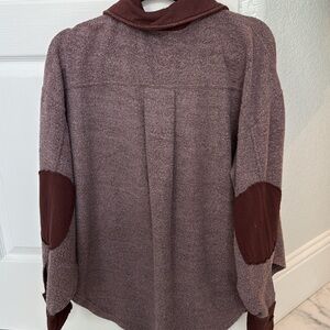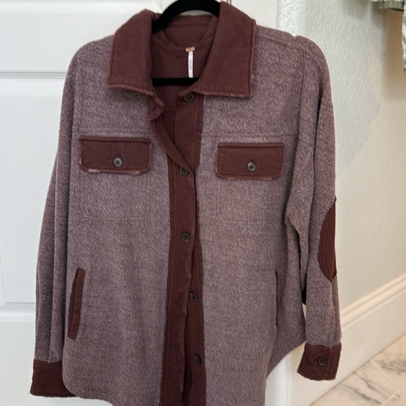 Stylish long sleeve top by Free People. Features a button-up front and dual chest pockets. Elbow patches add a unique touch.