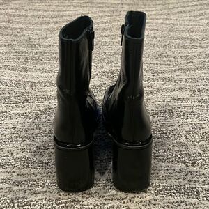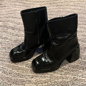 An FP favorite, these so classic ankle boots are now featured in a shiny patent leather with a bold platform sole, side zip closures, and comfy cushioned footbed.