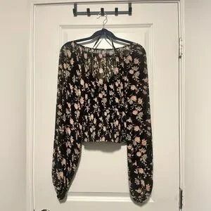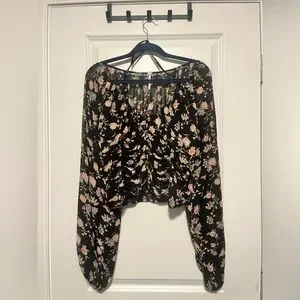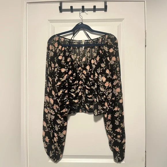 This Free People blouse features a fun floral pattern over a flattering black backdrop. The ruching in the front and elastic waist add to the flattering components. This top is great for everything from going to class, grabbing dinner with friends or a night out on the town.