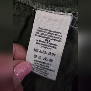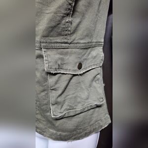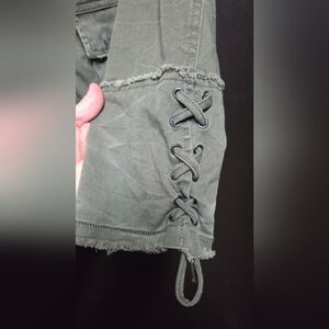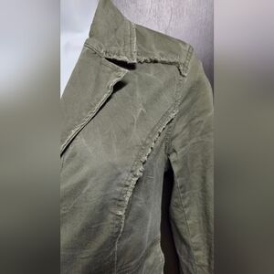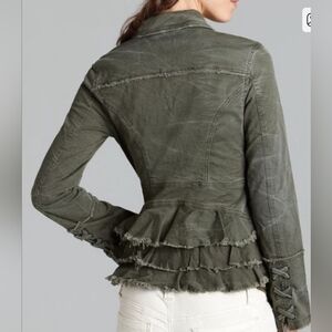 Free People Olive green distressed jacket with ruffle hem and corset tie cuffs. A super uniform and feminine twist to a utility jacket.