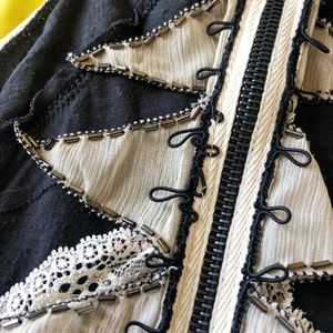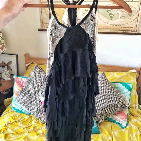 An incredibly unique Free People mini dress that could also be worn as a top. Soft black ruffles that give a vintage, almost 1920s flapperesque vibe (but much more comfortable than most of those stiff, beaded gowns) down the front, with lace detailing that goes from the front neckline to the back. The back is GORGEOUS-- an ornate strip of soft lace, iridescent gunmetal beadwork and chiffon. It's a little witchy, a little antique, a little sexy, a little soft. Worn once, excellent condition.