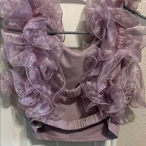 This elegant lavender top features delicate ruffles for a chic and feminine look. Perfect for any occasion. Open back with stretch straps