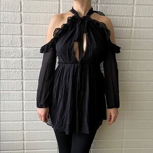 Style - This top has open shoulders, open back, sheer sleeves, lining in the chest/stomach, tie neckline, ruffles and flowy. There is also a zipper on the side.