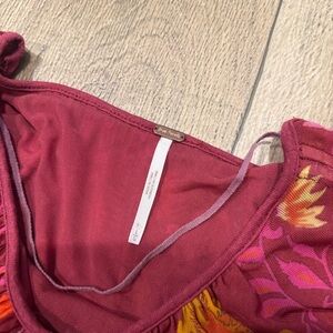 This vibrant Free People blouse showcases a striking red hue with ruffled accents and a relaxed fit. The 3/4 sleeves offer a touch of elegance, while the lightweight fabric ensures comfort and style. Adorned with a colorful floral pattern, this top is perfect for adding a playful touch to your wardrobe.