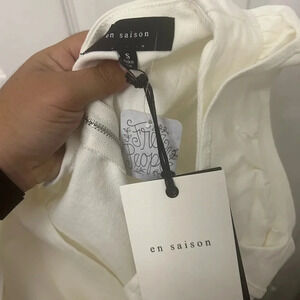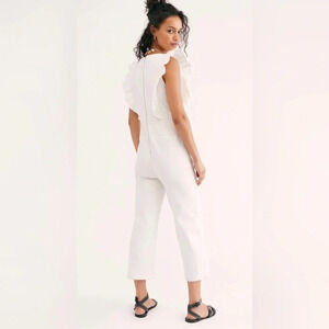 En Saison chick white denim jumpsuit with a bit of stretch. Front pockets