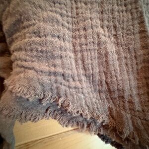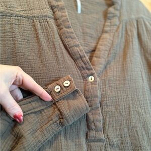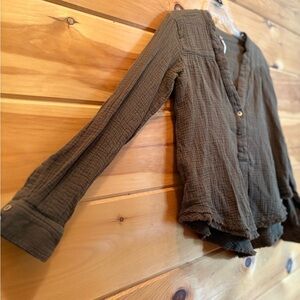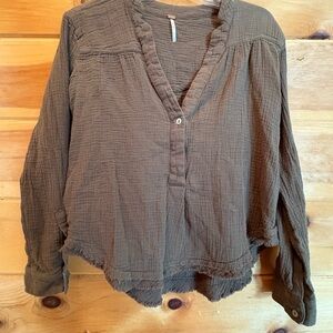 This elegant gray blouse from Free People features a relaxed fit with ruffled accents and a sophisticated mandarin collar. The long sleeves add a touch of grace, making it a versatile addition to any wardrobe.