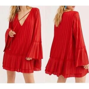 Free People Ruffled Pleated Oversized Short Red Dress Can't Help It Bell Sleeve