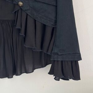 Structured meets spunky in this statement piece jacket! Features bold ruffles, vintage brass-style buttons, and that iconic band jacket silhouette. Think: NYC streetwear meets Girl Meets World vibes. A rare and quirky Free People gem.