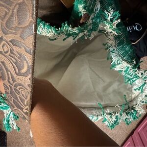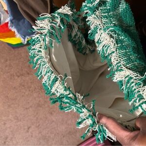 Oversize Free People Rug Bag. Never used, perfect condition Stylish green floral woven tote bag with fringe details and a brown strap. New with tags