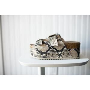 Turn heads in these so bold and statement-making sandals featured in a slip-on style and two-strap design with a chunky flatform sole, studded embellishments, and buckle detailing.