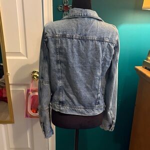 Stylish denim jacket. Classic button-up front. Two chest pockets. Long sleeves with button cuffs.